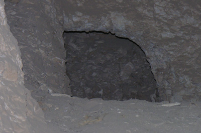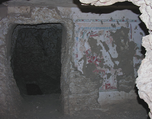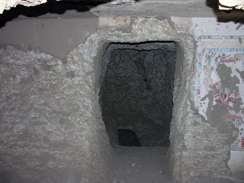 Hier noch ein Blick in die Grabkammer mit einem tiefen Schacht und der linken Wand der Querhalle neben dem Eingang zur Grabkammer. |