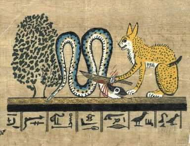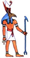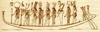 Oder man begleitete den Sonnengott Re in dessen Sonnenbarke und überquert in seiner Tagesbarke das Himmelsgewässer sowie in seiner Nachtbarke die Unterwelt, wo sie von dem Schlangendämon Apophis bedroht wird. | ||