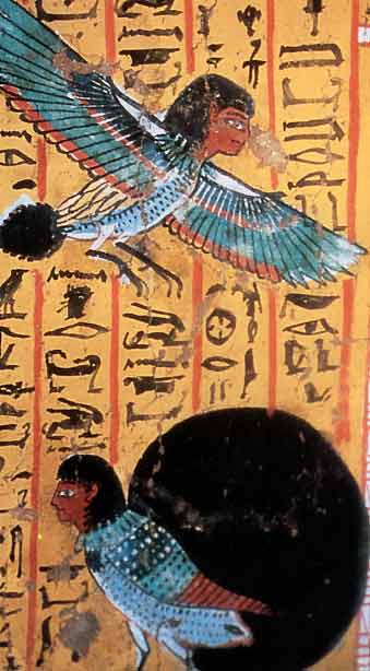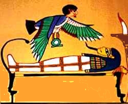 Oft ist auf den Grabmalereien ein vogelähnliches Wesen mit Schwingen dargestellt. Es ist der "Ba", die Geistesseele. Man glaubte, daß dieser "Ba", die Seele des Verstorbenen, nach dem Tod aus dem Körper austritt und jede beliebige Gestalt annehmen, also auch durch die sogenannten Scheintüren in den Gräbern treten und die Lieblingsorte des Verstorbenen, in der realen Welt aufsuchen kann. Nach dem Glauben der Ägypter war das Wesen des Menschen vielgestaltig, also "Ba" nicht die einzige Seele des Verstorbenen. |