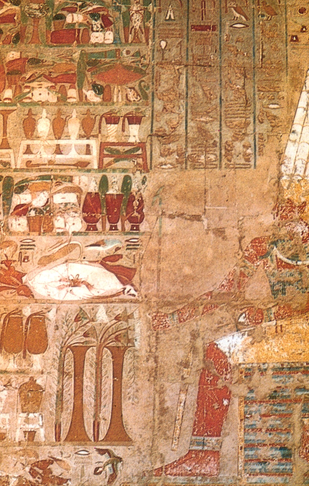 Entsprechend der Jenseitsvorstellungen der alten Ägypter benötigte der Tote auch neben den Grabbeigaben Opfer an Brot, Bier, Rindern, Geflügel sowie Kleidung. Also alles an guten und reinen Dingen, von denen ein Gott lebt. Es mußten nicht nur reale Dinge sein, es genügte auch, wenn diese Dinge als Opferformel aufgesagt wurden und die realen Gegenstände als Modelle oder auf Zeichnungen an den Grabwänden „geopfert“ wurden. | |||