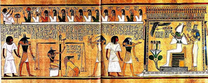 Hier ist eine Szene von den sogenannten ägyptischen Totenbüchern zu sehen, in der der Wert des Verstorbenen bewertet wird, bevor er vor Osiris treten darf. Links wird der Verstorbene von Anubis herangeführt. Dieser wiegt im nächsten sein Herz (sein Gewissen); Thot hält das Ergebnis fest. Anschließend bringt Horus den Verstorben vor Osiris. |